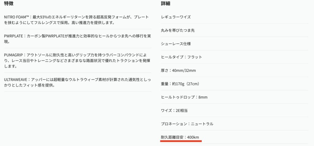 プーマは耐久距離を明記している珍しいメーカー。例えば『FAST-R ニトロ エリート 3』は約150kmと記載あり。