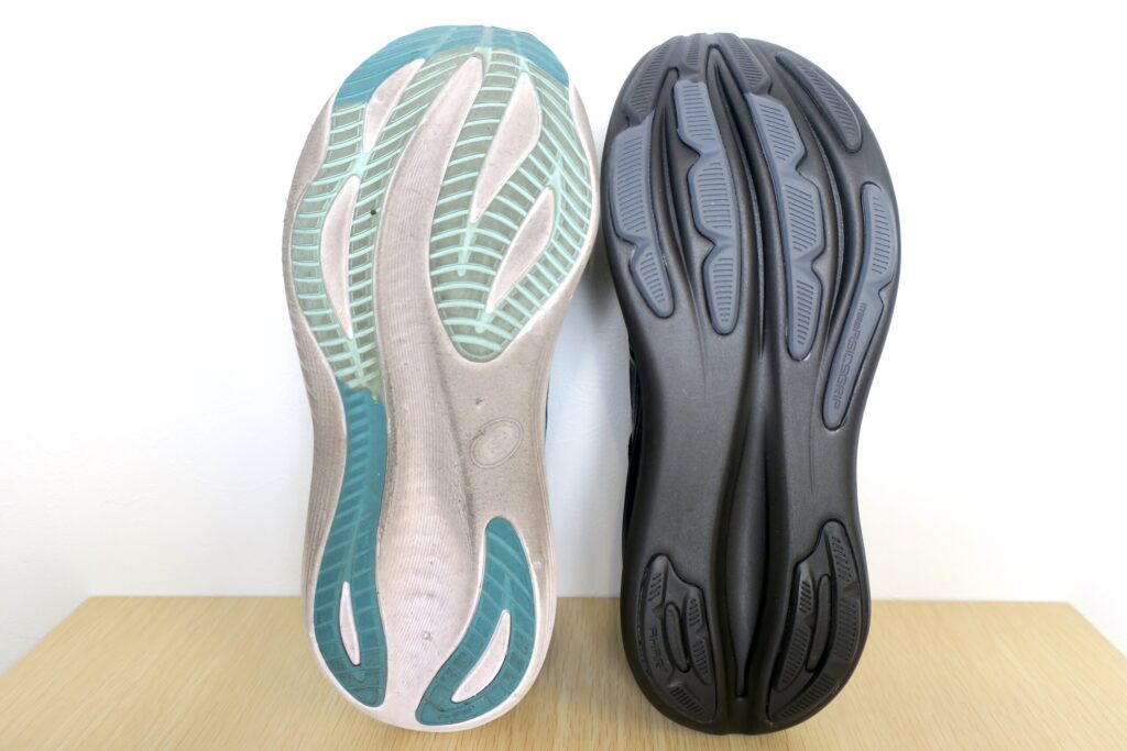 シューズの印象を決めるミッドソールは全く変わらない。使われている素材も同じであるが、硬度の違いも感じられない。「グニョ」って潰れ切るミッドソールではなく、柔らかいが芯(腰)のあるクッション性。良く言えば、トレッドミルなど柔らかい路面でも安定して蹴って走ることができる。悪く言えば、クッションシューズに求める「とにかく柔らかいシューズ!」という特徴は弱い。