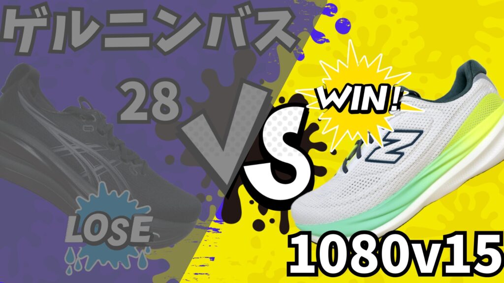 本当に1080v15の方が好みであり走行性能は高い!ただ、同じ価格帯としての機能性が高いのはゲルニンバス28かも…。複数足を履き回している身としては、やはりクッションシューズには柔らかさを求めたい!結果として1080v15を推しているが、次作のゲルニンバス29が柔らかいクッションシューズに回帰した際はオススメ度が逆転するかも。それくらいどちらも良いシューズ。2足とも購入した私は、リカバリージョグは1080v15で行い。不整地や風が強くトレミに避難する日はゲルニンバス28を使用する贅沢コースで満喫していく予定。次作発売されるまでに履き潰せるよういっぱい走ります。