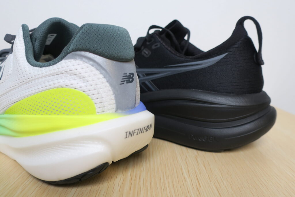 ミッドソールの厚みはゲルニンバス28の方が分厚い。またプルストラップ付きで着用時に便利。アッパー素材がニットであることからも履き心地は快適であり、コロンと転がるライド感があるためタウンユースにおいても楽に歩ける。