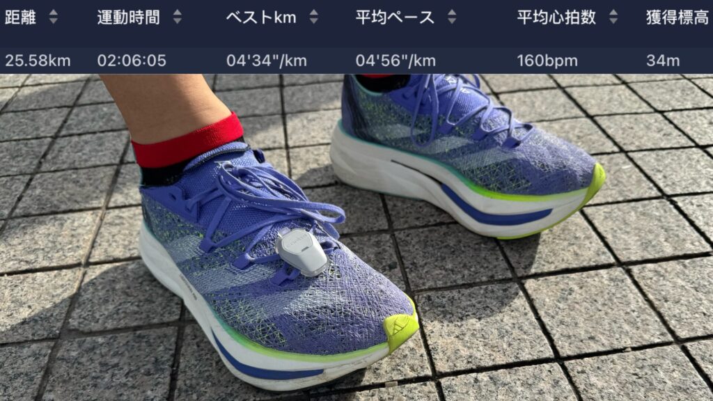 岡山マラソンの試走を兼ねてロングジョグ。走っていると岡山マラソンの歴代Tシャツを着用しているランナーが多く、みんな試走しているのかな?っと謎に仲間意識が芽生えた。前々日にインターバル、前日に20キロジョグを実施したため楽に走れるシューズと思いプライムX2で出陣。やはり楽に進めるが、ミッドソールが分厚すぎて遅いペースだと地面の凹凸に足が持って行かれるのが玉に瑕たまにきず