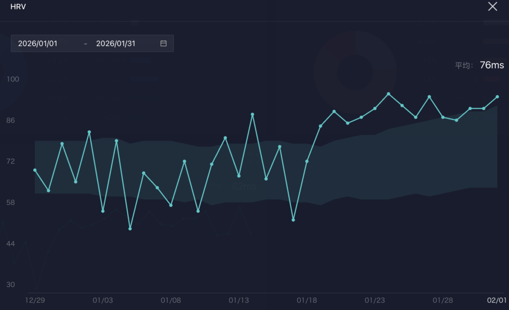 睡眠の質(HRV)に関しては、ダイエットを始めて身体から不純物が抜けた?時からビビるくらい上がってて最高。HRVが高いことで練習の質も高く取り組めていることを実感する。今では睡眠の質が低かった時の感覚を思い出せないくらい毎日身体が軽い。