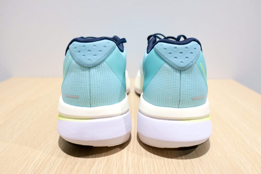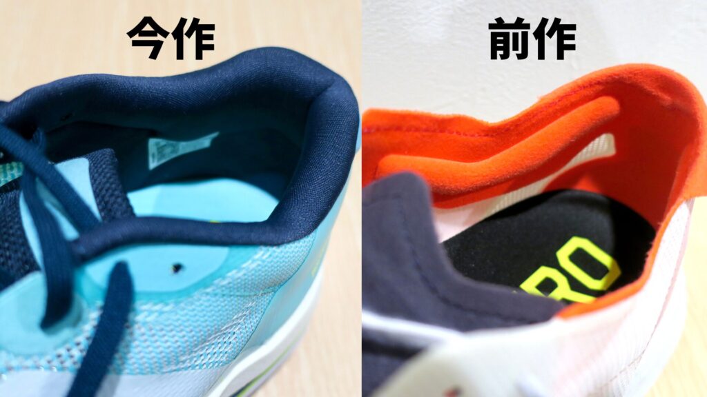 公式発表で前作より15g軽量化に成功。軽量化のデメリットとして、フィット感が損なわれがちであるが、今作はフィット感を上げつつ軽量化を実現。前作は踵部のクッション材が少なく、ホールド感が微妙であったが、今作は肉厚なクッション材を搭載。またガセットタン構造により、甲周りのフィット感は引き続き良好で、シューズ全体で足をガッチリと固定してくれるようになった。これにより長時間着用するロング走においても、最後まで違和感なく完走できるようになった。