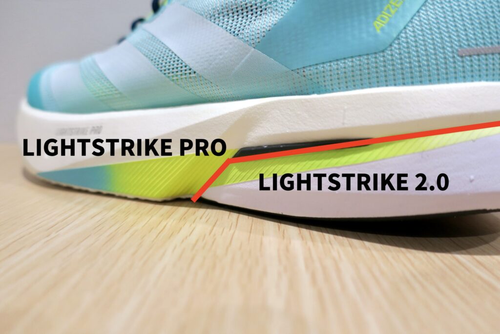 前作よりLIGHTSTRIKE PROが13.8%増量。っと公式情報を聞いていたが、増量による反発力向上を体感することは出来なかった。またプレートとして搭載されているENERGYRODS 2.0は助力目的というより、安定感向上を狙ったギブス的な役割と感じた。