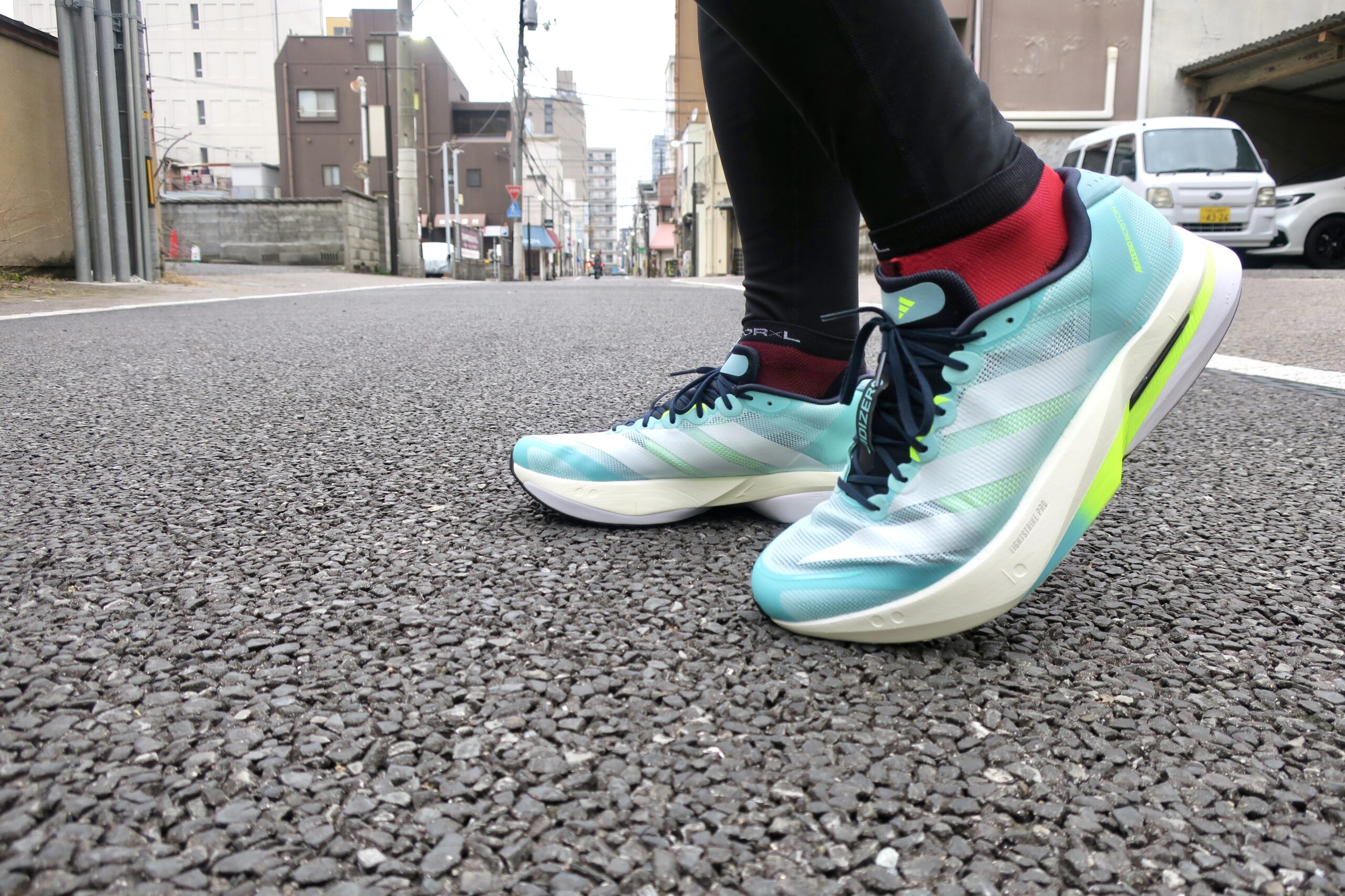 アディゼロジャパン8を分厚くしたシューズ。
