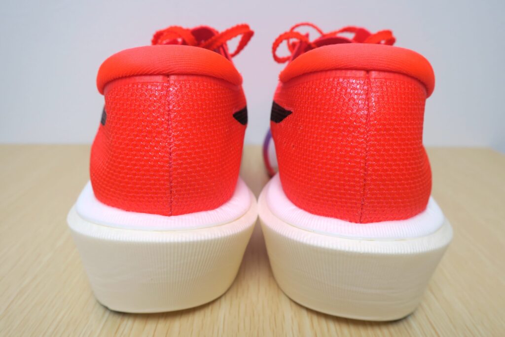 軽量化を重視し反射材などの装飾なし。今作は踵周辺にミッドソールが張り出しており、安定感向上を狙った作りだと窺える。(アルファフライ3を真似た?構造)
