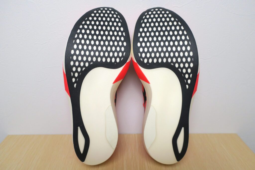 遅いペースでは出力を下げて楽に巡航。早いペースでは足の送り出しが早まり強制ピッチ走法。っといった具合にペースによってシューズの特性が明確に変わるのは面白い。サブ3.5ペースでも使えるが、ペースを上げたくなる自制心を抑え、安定感の低い柔らかなミッドソールを体幹で維持させ続けるのはかなり疲れる。ただ、ハイペースで新作が発売されたため、次作は少し期間が開くのではないか?と推測。そのため欲しいカラーが出たタイミングでモチベを上げるために、未来のレースシューズを確保しておくのはありだと思う。