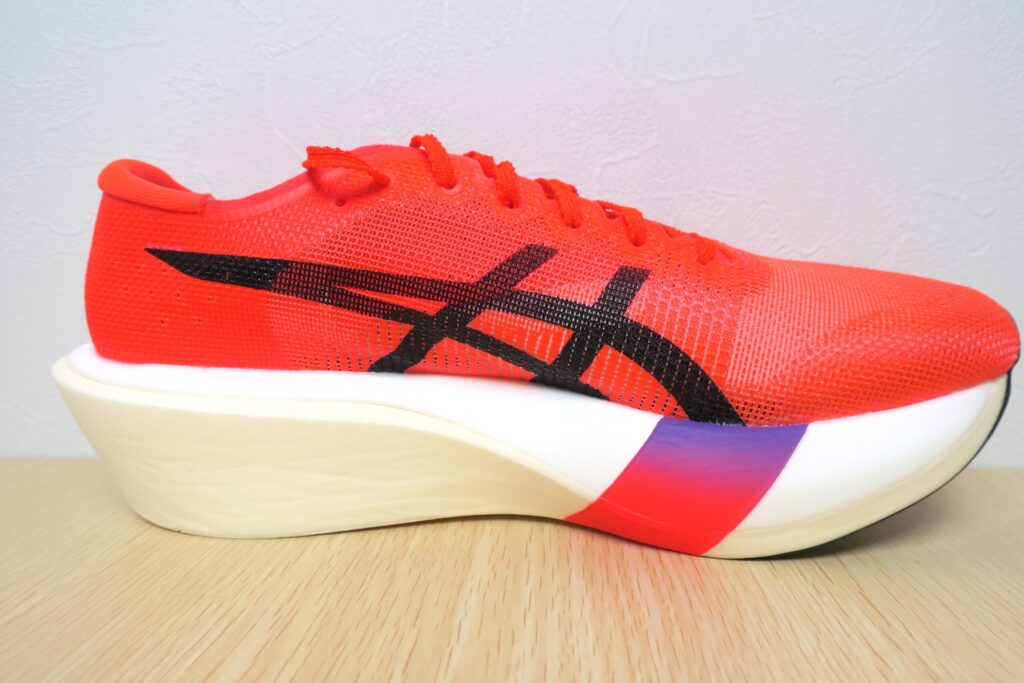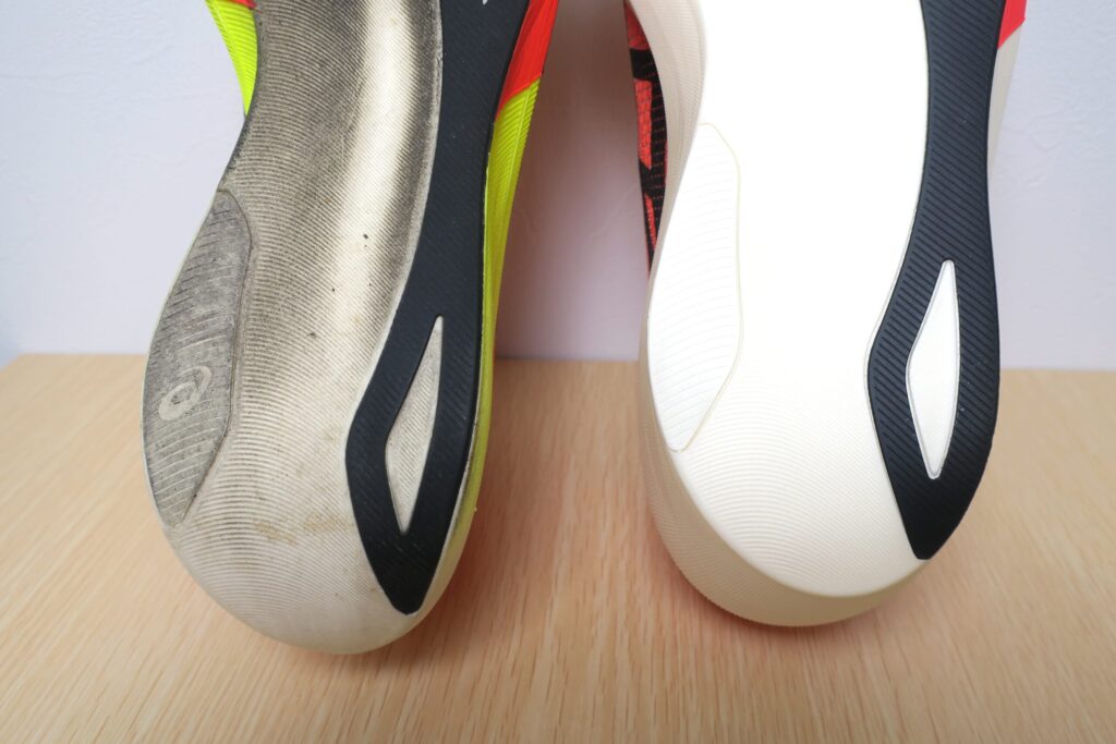 前作からちゃんと進化しているというか、もはや別物のシューズに仕上がっててワロタ。前作は硬めのミッドソールが潰れにくく反発レスポンスが早く、ピッチを上げて走れるシューズであった。今作はクッション材が潰れて体重が前に倒れ込むことで進んでいくシューズに変わっている。ピッチを上げて走るという目的において同じ結果となるが、アシックスの答えの出し方が明らかに変わった。これは選り好みが別れる予感がする。