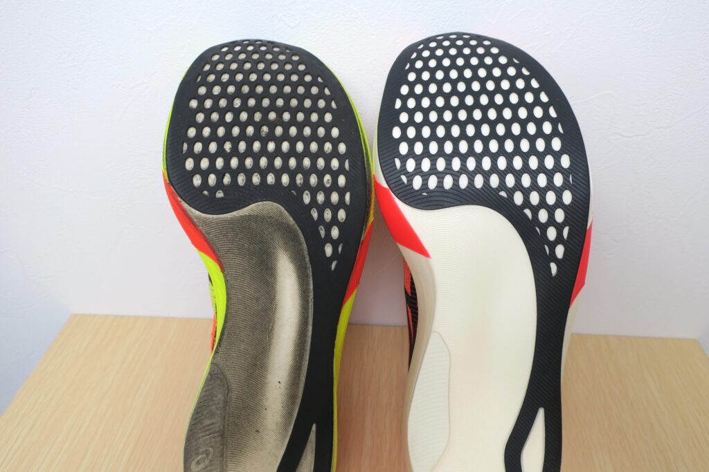 非常に軽い。前作も軽さで驚いたが、それを上回るパワーアップをこの1年で実現するアシックスの底力が半端ない。軽量化戦国時代の最前線に立つシューズ。