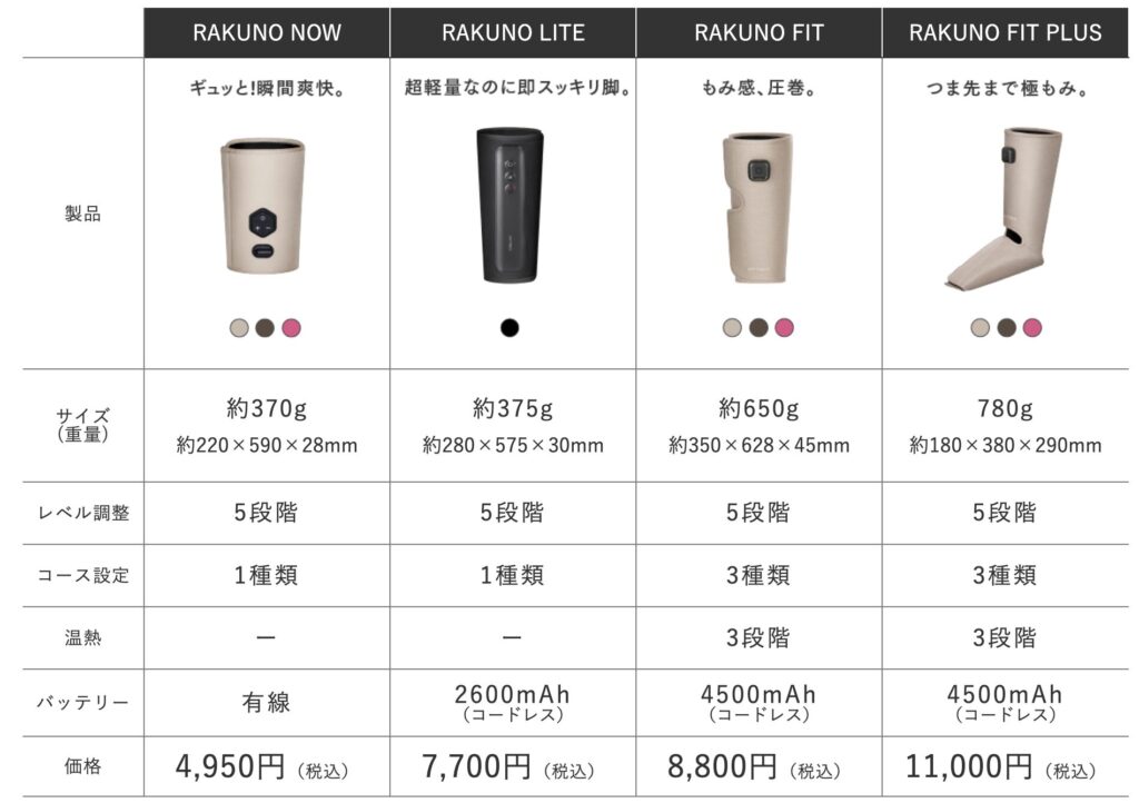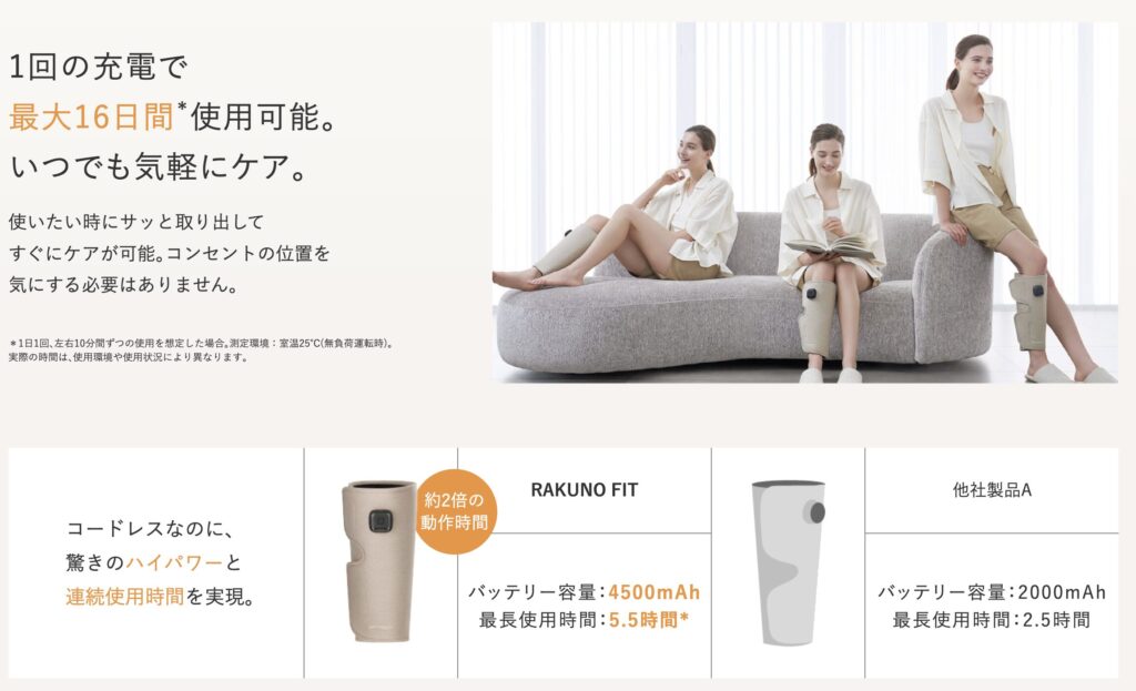 ふくらはぎは第二の心臓とも呼ばれており、心臓から足先へ送られた血液を重力に逆らって戻すポンプのような重要な役割を果たす場所。そこを温めることで血行を促進させ、疲労物質の排出や栄養・酸素供給が促され、筋疲労の回復を早めることが出来る。マッサージだけでなく温めることも出来るのはポイントが高い。同社で複数種類のマッサージ機が発売されているが、温熱機能を持っているのは『RAKUNO FIT』シリーズのみ。