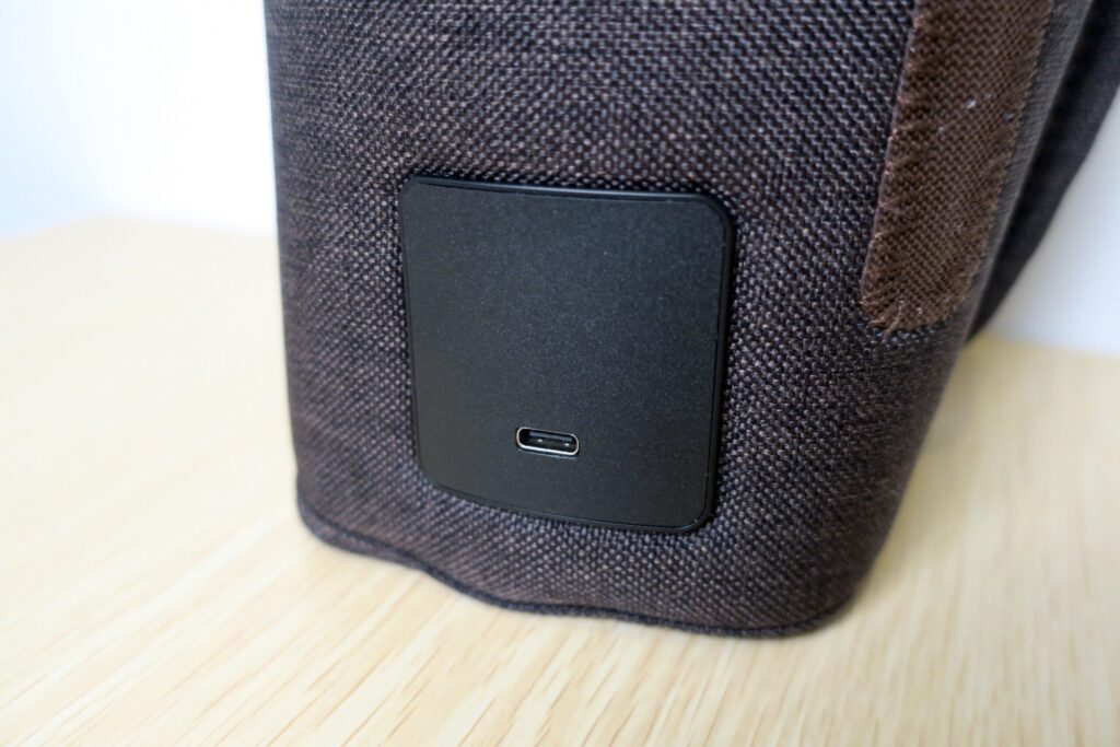 下部にUSB Type-Cの充電ポートが備わっている。縦長の茶色は小さく折り畳む時に留めるマジックテープ。