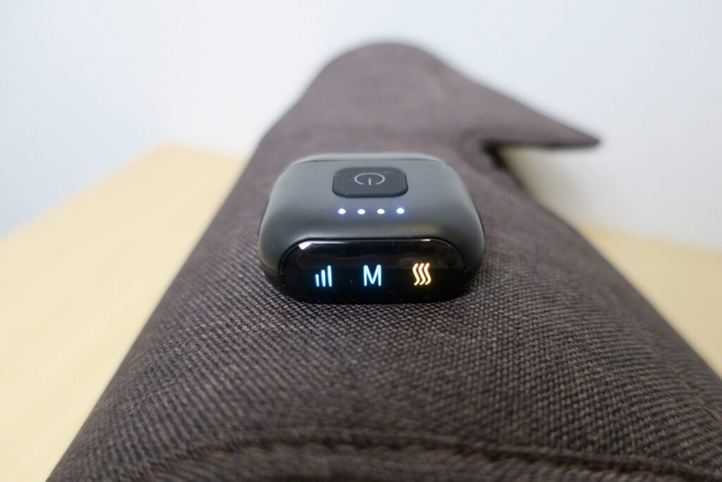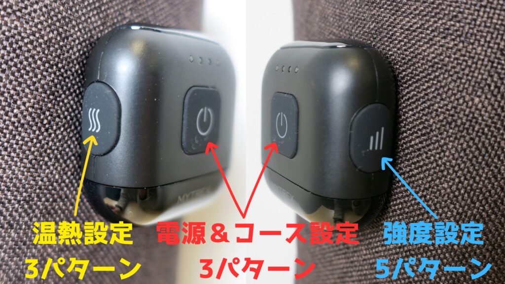 まずは中央のボタン3秒長押しで電源ON。その後、電源ボタンクリックでコースを変更することができ、コース設定後に強度と温熱設定を好みに合わせればOK。またマッサージ開始後10分で電源自動OFFになる。
