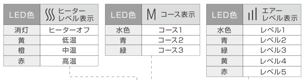 現在の設定内容は色で判別できる仕組みになっている。またバッテリー残量もランプ数で表示あり。